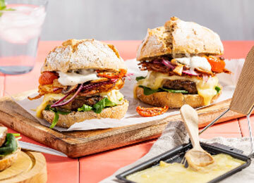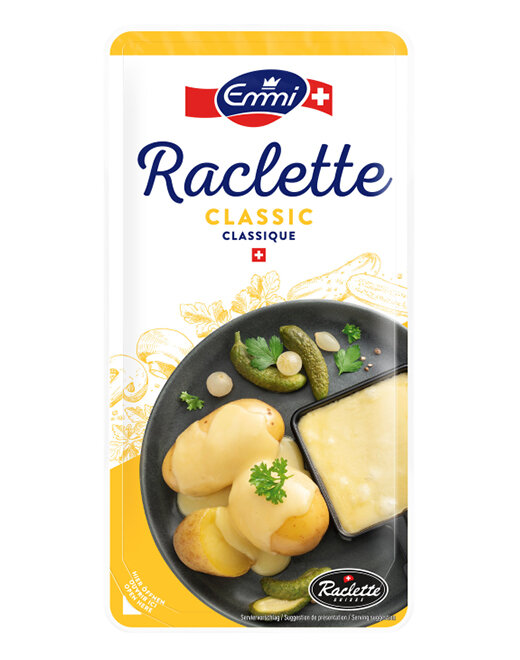 ラクレットのスライスタイプ。ラクレットというチーズの名前はフランス語で削り取るという意味の”Racler(ラクレ)”が由来。家庭でも気軽に楽しめるスライスタイプとなります。ホットプレートやテフロンのフライパンで溶かしたチーズをジャガイモやパンにつけてお召し上がりください。