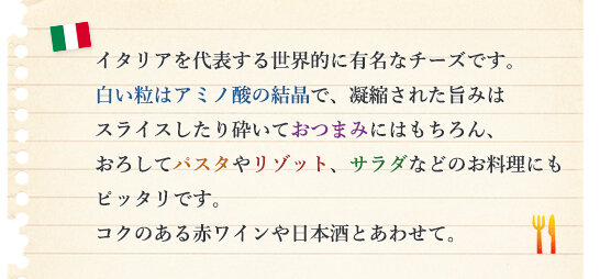 オレンジ色が鮮やかなマイルドでナッツのような風味を持つチェダーチーズです。親しみやすい味わいはいつでも、どこでもお楽しみいただけます。おつまみはもちろん、サンドイッチやチーズ料理にもお使いいただけます。